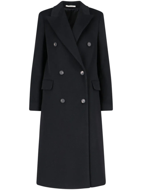 black cashmere double-breasted button fastening peak lapels long sleeves buttoned cuffs two side flap pockets central rear vent straight hem