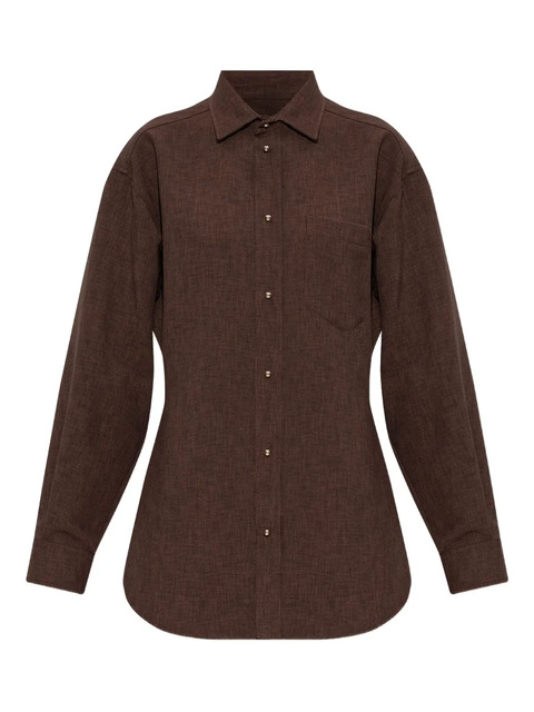 brown button fastening chest pocket long sleeves buttoned cuffs curved hem
