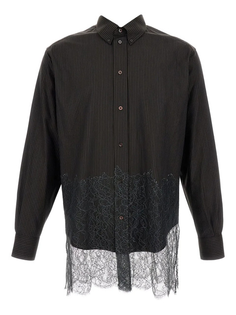 black pinstripe pattern button-down collar mother-of-pearl buttons lace insert double-layer effect