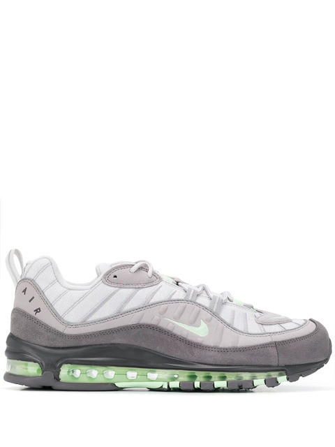 Designed in 1971 to represent movement and speed, Nike’s instantly recognisable Swoosh logo is a signature label hallmark. Presented in grey and mint green leather, these Air Max 98 sneakers from Nike feature a round toe, a signature Nike swoosh, a lace-up front fastening, contrasting panels and a signature Nike Air sole.