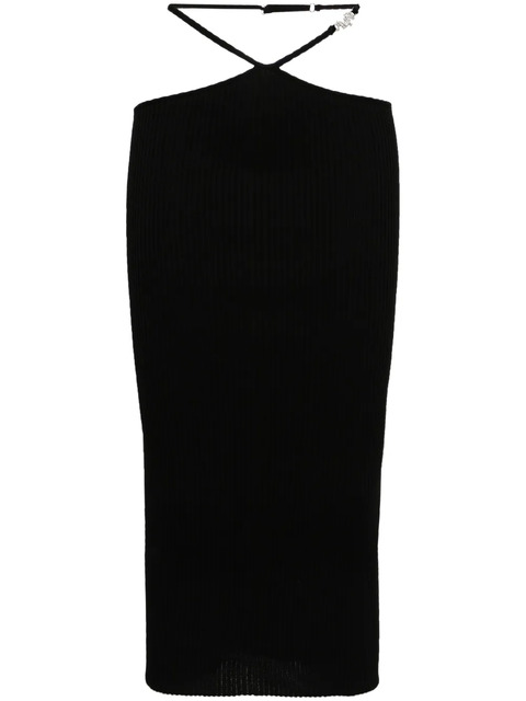 black cotton-silk blend fine ribbed strap detailing silver-tone logo plaque pencil design high waist straight hem mid-length unlined