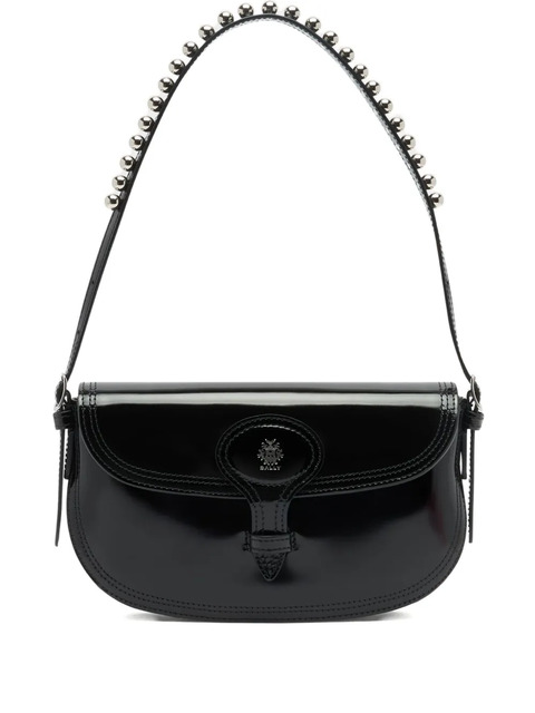 black brushed calf leather foil logo stud embellishment shoulder strap flap closure
