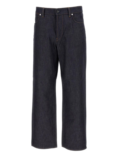 blue five pockets detachable badge contrast stitching zip fly branded button closure