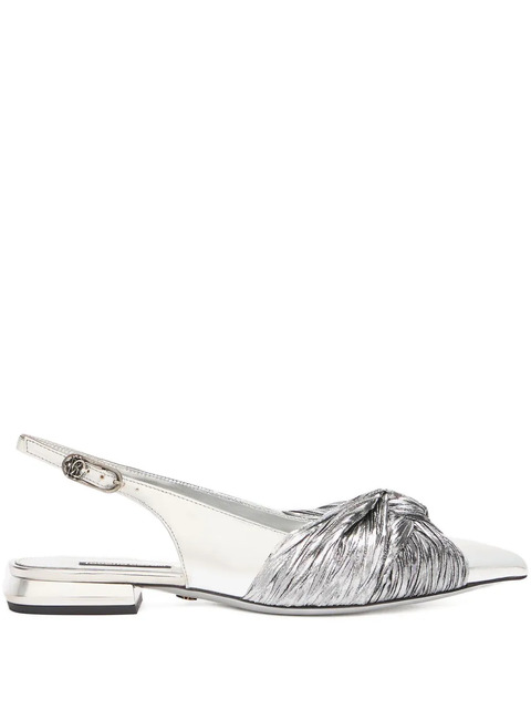 silver tone leather metallic finish pointed toe slingback strap buckle fastening knotted detail