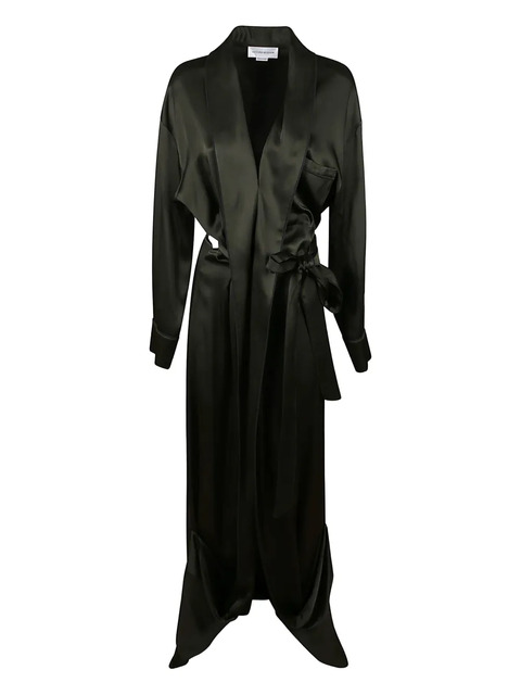 dark olive piped trim chest pocket tie fastening long sleeves buttoned cuffs