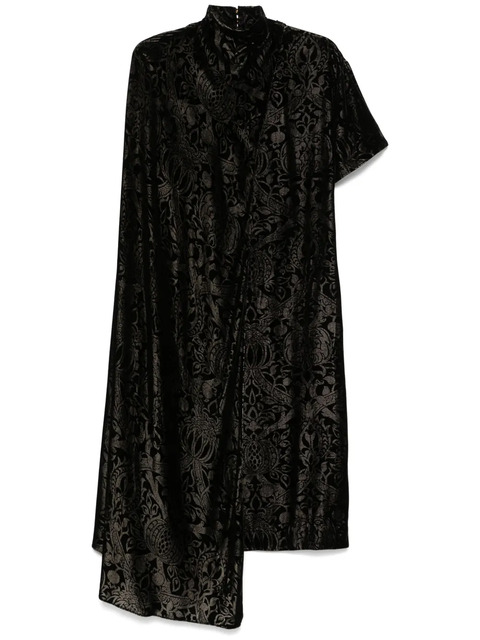 black velvet effect patterned jacquard rear button fastening draped panel detail mock neck short sleeves two side slit pockets shift style keyhole detail to the rear straight hem mid-length