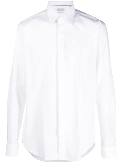 optical white stretch-cotton classic collar concealed front button fastening long sleeves buttoned cuffs curved hem