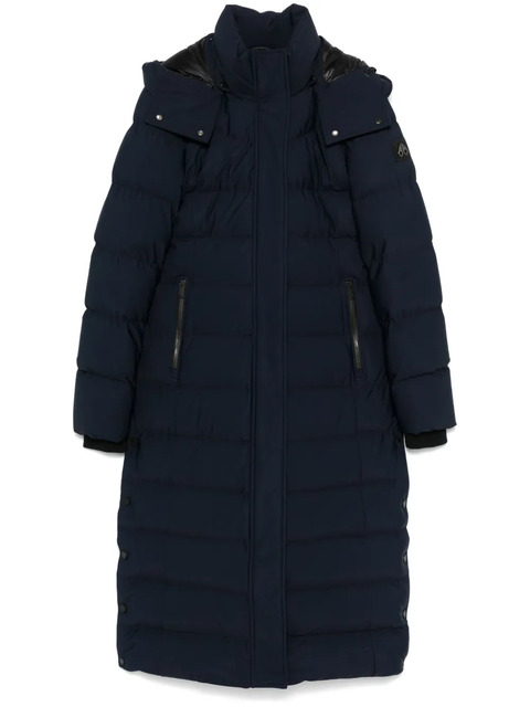 oxford blue shell water-resistant water-repellent finish wind-resistant quilted padded design concealed front press-stud and zip fastening side press-stud fastening high neck detachable drawstring hood long sleeves logo patch at the sleeve ribbed cuffs two side zip-fastening pockets quilted lining straight hem mid-length