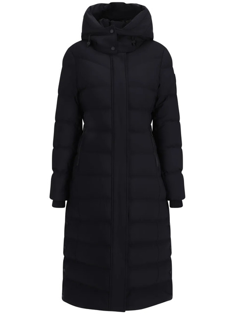 black feather down padded design front press-stud and zip fastening drawstring hood funnel neck long sleeves appliqué logo ribbed cuffs two side zip-fastening pockets straight hem long length