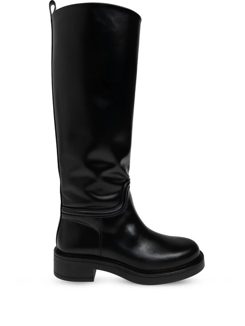 black calf leather smooth grain panelled design slip-on style low block heel mid-calf length pull-tab at the heel round toe leather lining rubber sole