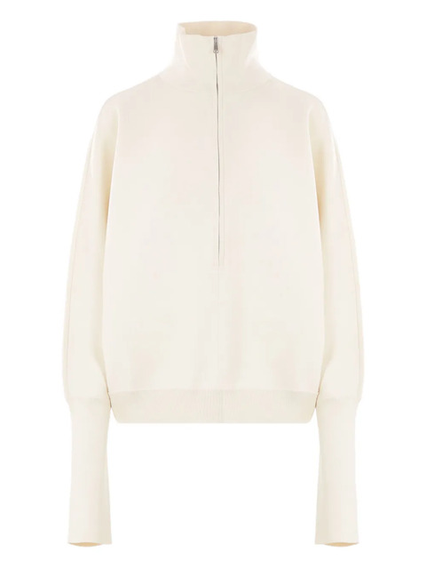 beige high neck partial zip closure long sleeves ribbed edges embroidered logo