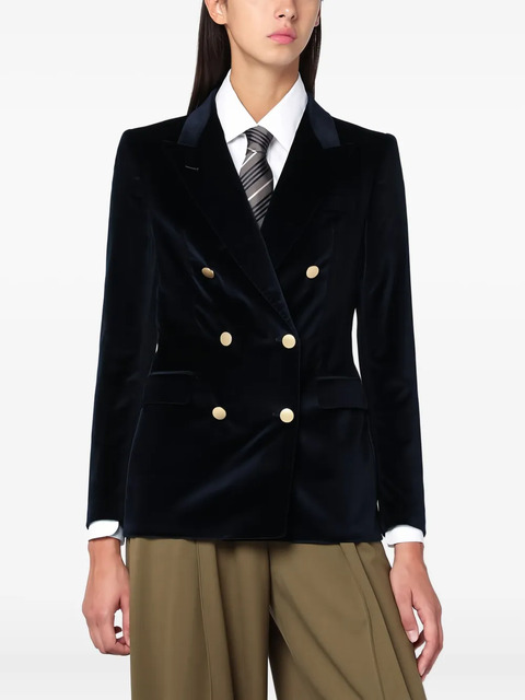 navy blue velvet texture peak lapels double-breasted button fastening welt pocket
