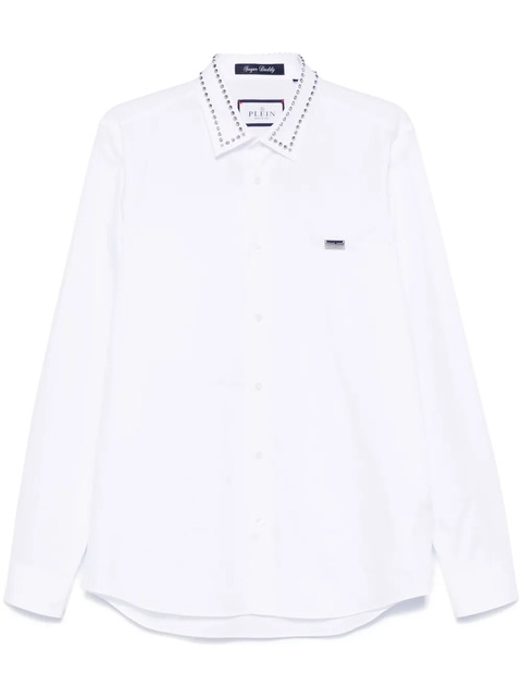 white cotton poplin texture front button fastening classic collar spike stud detailing logo plaque long sleeves buttoned cuffs curved hem