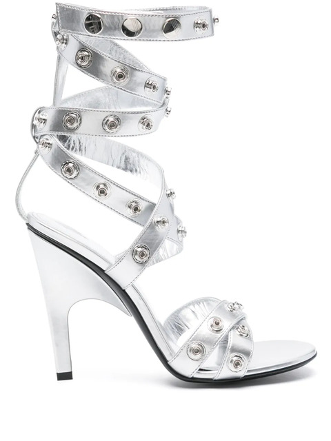 silver-tone faux leather metallic effect decorative button detailing tonal hardware round open toe branded leather insole crossover strap detail high sculpted heel leather outsole press-stud fastening This piece comes complete with a protective dust bag.