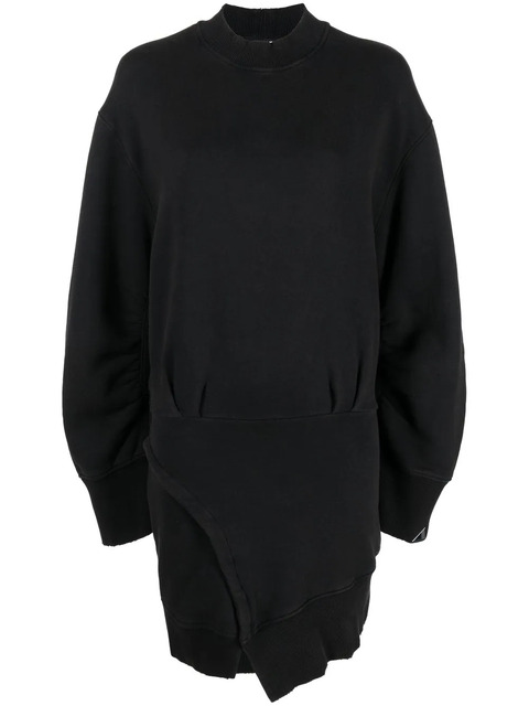black cotton ribbed detailing distressed effect asymmetric design round neck drop shoulder long sleeves above-knee length