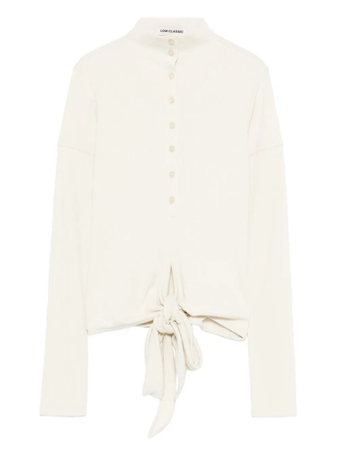 cream white ribbed knit button fastening tie detailing high neck long sleeves
