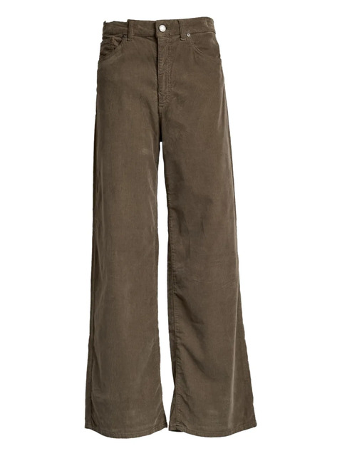 brown corduroy texture belt loops five pockets wide leg concealed fastening