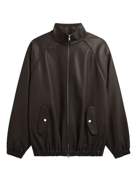 brown faux leather two-way zip fastening stand-up collar puff sleeves elasticated trims welt pockets