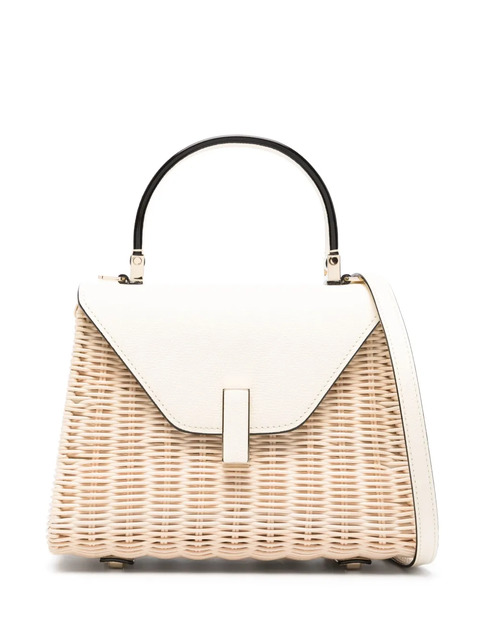 white beige calf leather rattan wood reeds turn-clasp fastening single flat top handle adjustable detachable shoulder strap foldover top metal feet main compartment internal logo stamp internal patch pocket This piece comes complete with a protective dust bag.
