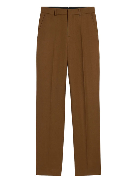 brown front pleats concealed front fastening side slit pockets rear welt pockets V-cut detail