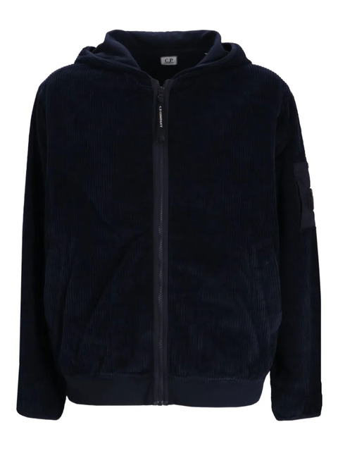 dark blue corduroy texture hooded zip fastening long sleeves C.P. Company suggests removing any detachable accessories before washing.
