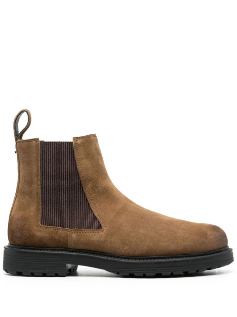 camel brown calf leather ankle-length pull-tab at the heel elasticated side panels round toe branded insole flat sole