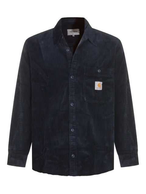 navy blue cotton corduroy chest patch pocket front button fastening long sleeves buttoned cuffs