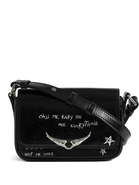 black bovine leather silver-tone hardware shoulder strap graffiti design signature wings