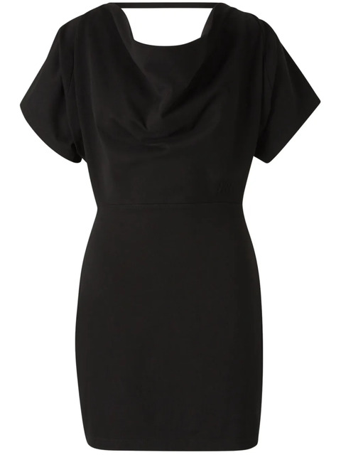 black cotton concealed side zip fastening cowl neck short sleeves embossed logo to the front fitted waistline straight hem thigh-length