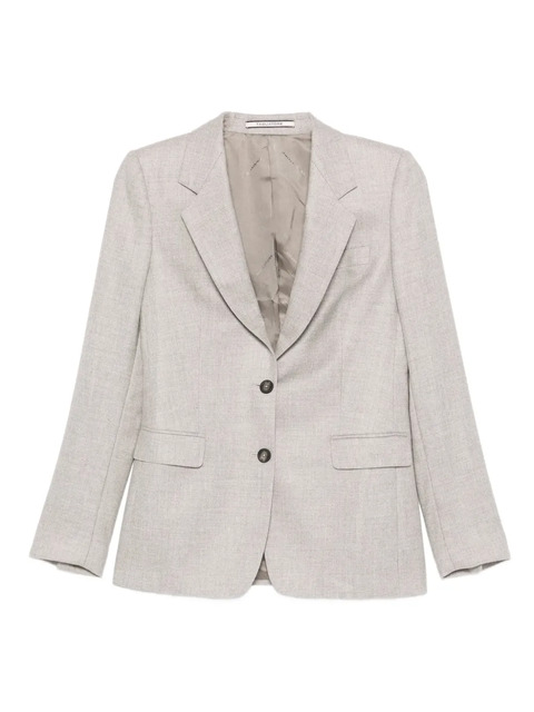 grey notched lapels front button fastening two front patch pockets long sleeves straight hem
