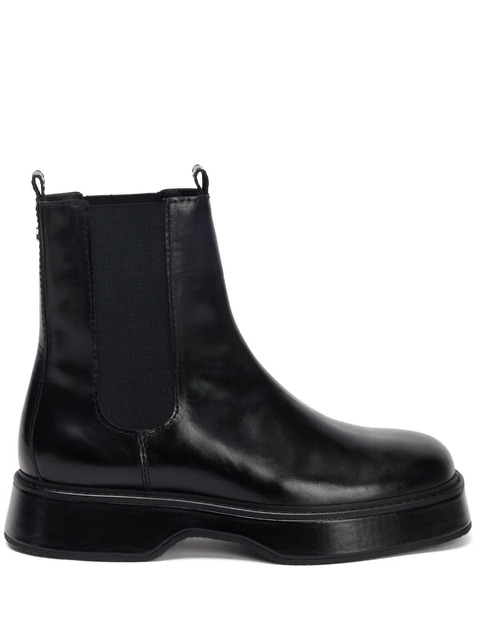black leather elasticated side panels double pull-tab at the opening square toe ankle-length flat rubber sole