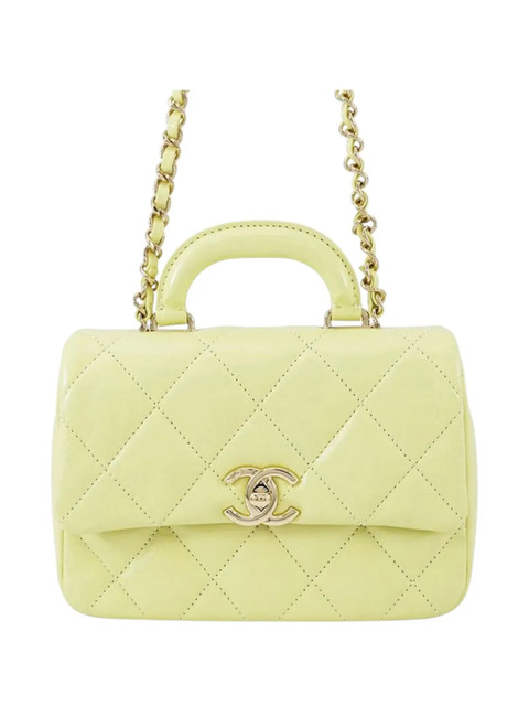 quilted leather body flat top handle leather woven chain strap with leather shoulder guard front flap with CC turn-lock closure exterior back slip pocket interior zip and slip pockets yellow Inclusions: dust bag. Condition: EXCELLENT. This previously owned item is in near-perfect condition with no signs of damage or use. Due to the exclusivity of this item and its limited availability, processing and delivery might take longer than usual. Please refer to the photos on this product page for a detailed view of the item, including any damages declared.