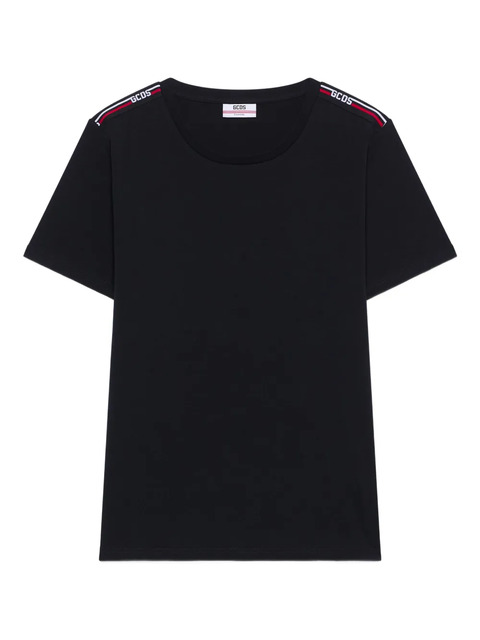 black stretch-cotton shoulder logo detail round neck short sleeves straight hem