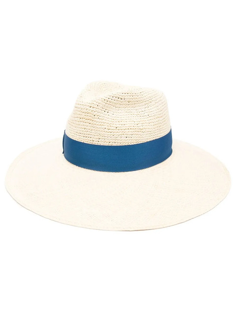 straw flat-peak hat from BORSALINO featuring beige, blue, straw, interwoven design, grosgrain ribbon trim, centre-dent crown and wide brim.