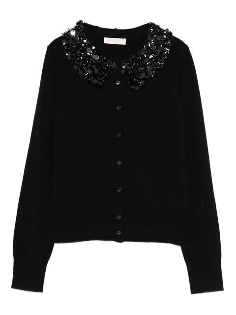 black cashmere sequin embellishment front button fastening long sleeves ribbed cuffs and hem