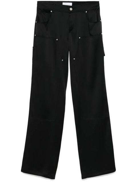 black satin weave concealed fly and button fastening mid-rise belt loops classic five pockets logo studs tab loop to the rear rear patch pocket straight leg