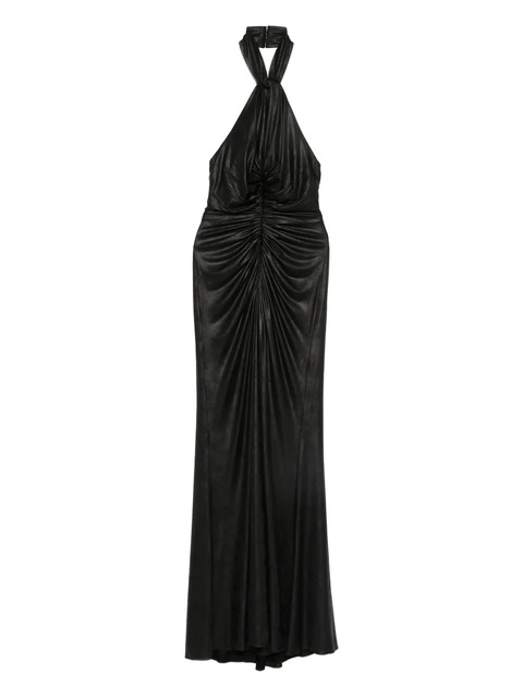 black halterneck ruched detailing sleeveless floor-length concealed rear zip fastening