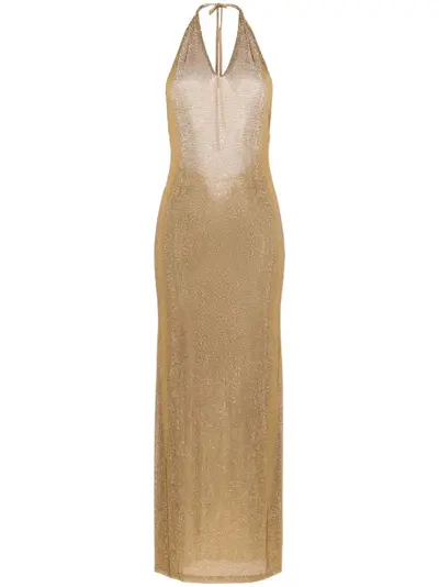 gold-tone mesh design rhinestone embellishment plunging V-neck halterneck tie fastening sleeveless low back concealed side zip fastening column silhouette straight hem long length