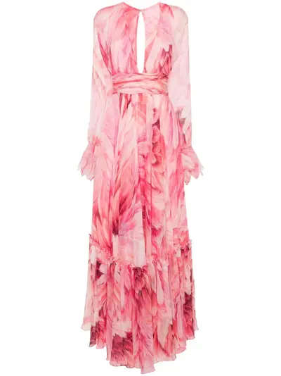 rose pink silk georgette crepe semi-sheer construction all-over Plumage print V-neck long puff sleeves with ruffle cuffs fitted waistline with pleat detailing flared skirt floor-length ruffle hem V-back partial lining concealed rear hook and zip fastening