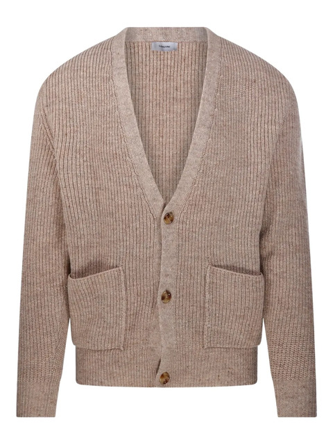 neutral beige ribbed knit V-neck front button fastening two front patch pockets long sleeves