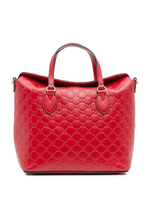 embossed leather body flat leather handles top fold-over flaps with magnetic snap closures interior zip and slip pockets red Serial Number: 428226 467891 This item has no inclusions. Condition: GOOD. This previously owned and used item is in good condition with minimal signs of use. This may include fading of material or plating and scratches. Declared Damages: Zipper Feature(s) Moderate Rust/Tarnish. Please refer to the photos on this product page for a detailed view of the item, including any damages declared.