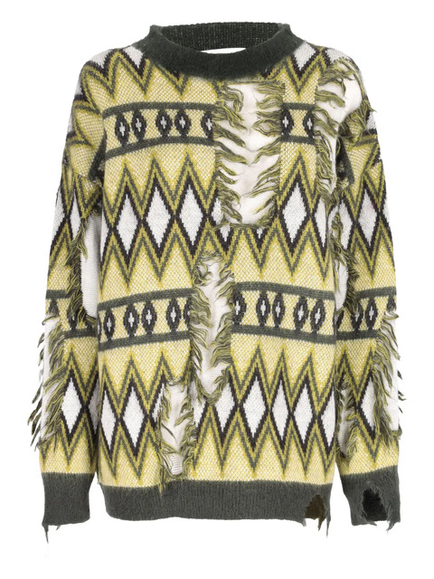 lime pattern jacquard fringed detailing round neck long sleeves distressed effect