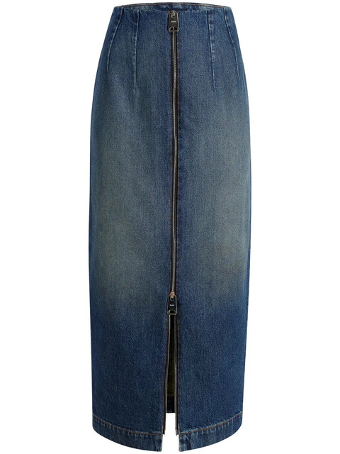 blue cotton denim front zip fastening high-waisted dart detailing front slit below-knee length straight hem