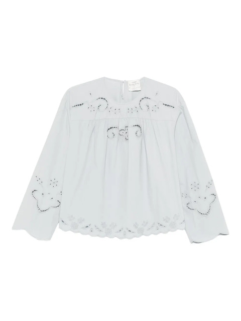 blue broderie anglaise detailing scalloped hem round neck long sleeves eyelet detailing