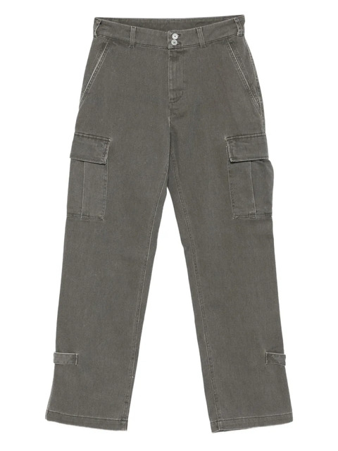grey button and zip fastening belt loops side cargo pockets back flap pockets
