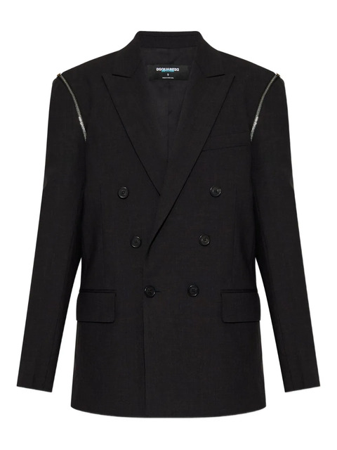 black virgin wool decorative zip detailing double-breasted button fastening peak lapels front flap pockets long sleeves