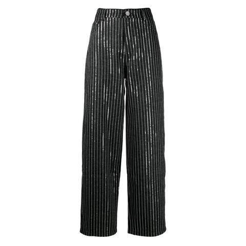 Rotate Ladies Bottoms. Fashion category: Pants & Leggings. SKU: 111791100. Color: Black. Rotate Sequin Twill Wide Leg Pants. Crafted from cotton in a durable twill weave, these Rotate pants combine modern design with a touch of glamour. The high-waisted, wide-leg silhouette is enhanced with subtle stretch for comfort, while vertical stripe embroidery and sequin embellishments add a striking, textured finish. Complete with belt loops, a front button and zip fastening, and the classic five-pocket construction, the design is elevated by a logo patch at the rear. Finished with a straight hem, these trousers bring together everyday wearability and standout detailing. 100% cotton.Lining: 92% polyester, 8% elastane.