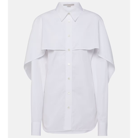 Stella McCartney Ladies Tops. Fashion category: Shirts & Blouses. SKU: 620122SMA90-9000. Color: Pure White. Stella McCartney Cape Layer Long Sleeve Shirt. Merging classic tailoring with modern structure, this shirt features a pointed collar, long sleeves, and a sculptural cape-like layer across the chest. Crafted from organic cotton and finished with tonal buttons for a clean, elevated look. Cape-effect overlay. Pointed collar and buttoned cuffs. Tonal button closure. 100% Organic cotton. Made in Italy.