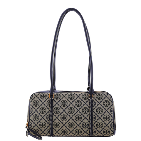 Tory Burch Ladies Satchel. SKU: 152455-405. Color: Tory Navy. Tory Burch T Monogram Small Marshmallow Satchel. Lightweight jacquard satchel with a 90s-inspired shape. Features a spacious double-zip design, slim shoulder straps, and ball-and-chain zipper pulls. Can be carried on the shoulder or as an oversized clutch. Finished with an embossed metallic Double T.