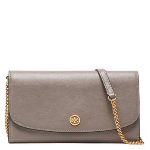 Tory Burch Ladies Wallets. SKU: 137152-082. Color: Gray Heron. Size: H: 4.5 x L: 8.1 x D: 1.4. Tory Burch Robinson Saffiano Leather Chain Wallet. The Robinson wallet is crafted from Saffiano leather, featuring a flap with a magnetic snap closure, an adjustable chain and leather crossbody strap with a 22.2 (56.5cm) drop, and includes 1 interior back wall bill pocket, 1 center zipper pocket, and 12 card pockets. Material: Leather.